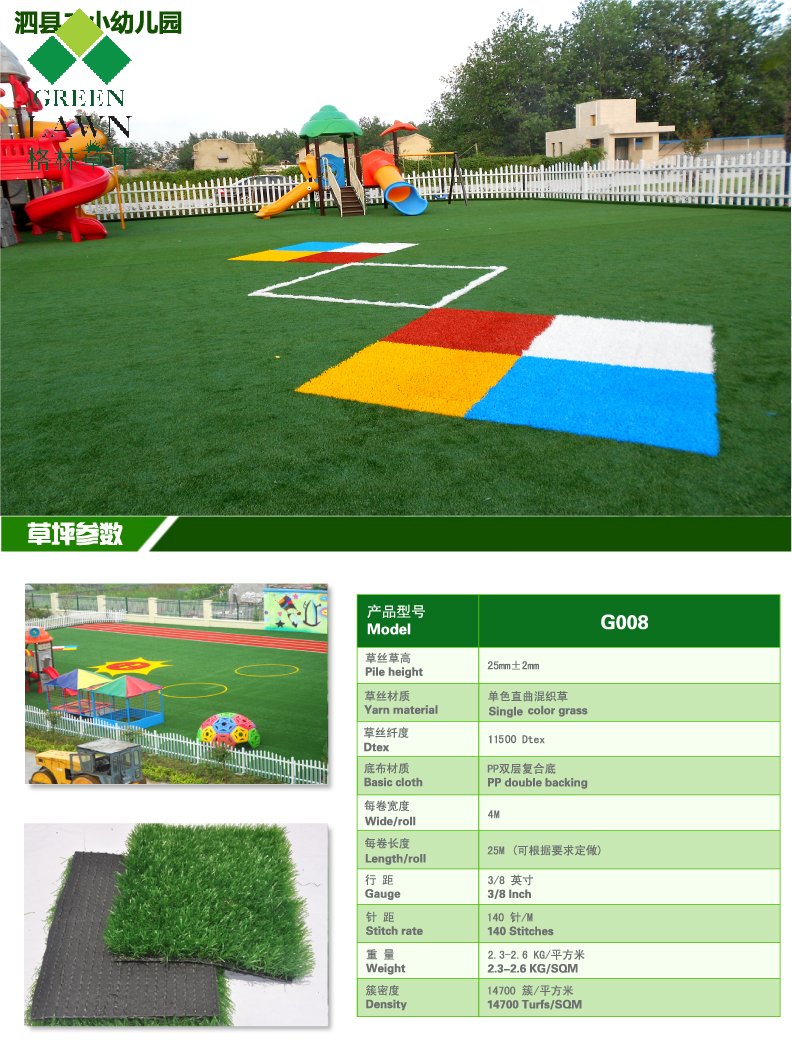 3、幼兒園人造草坪人工草原料環保,制品施工,工期較短,質量較易把握,檢驗簡略,不需太多專業知識。